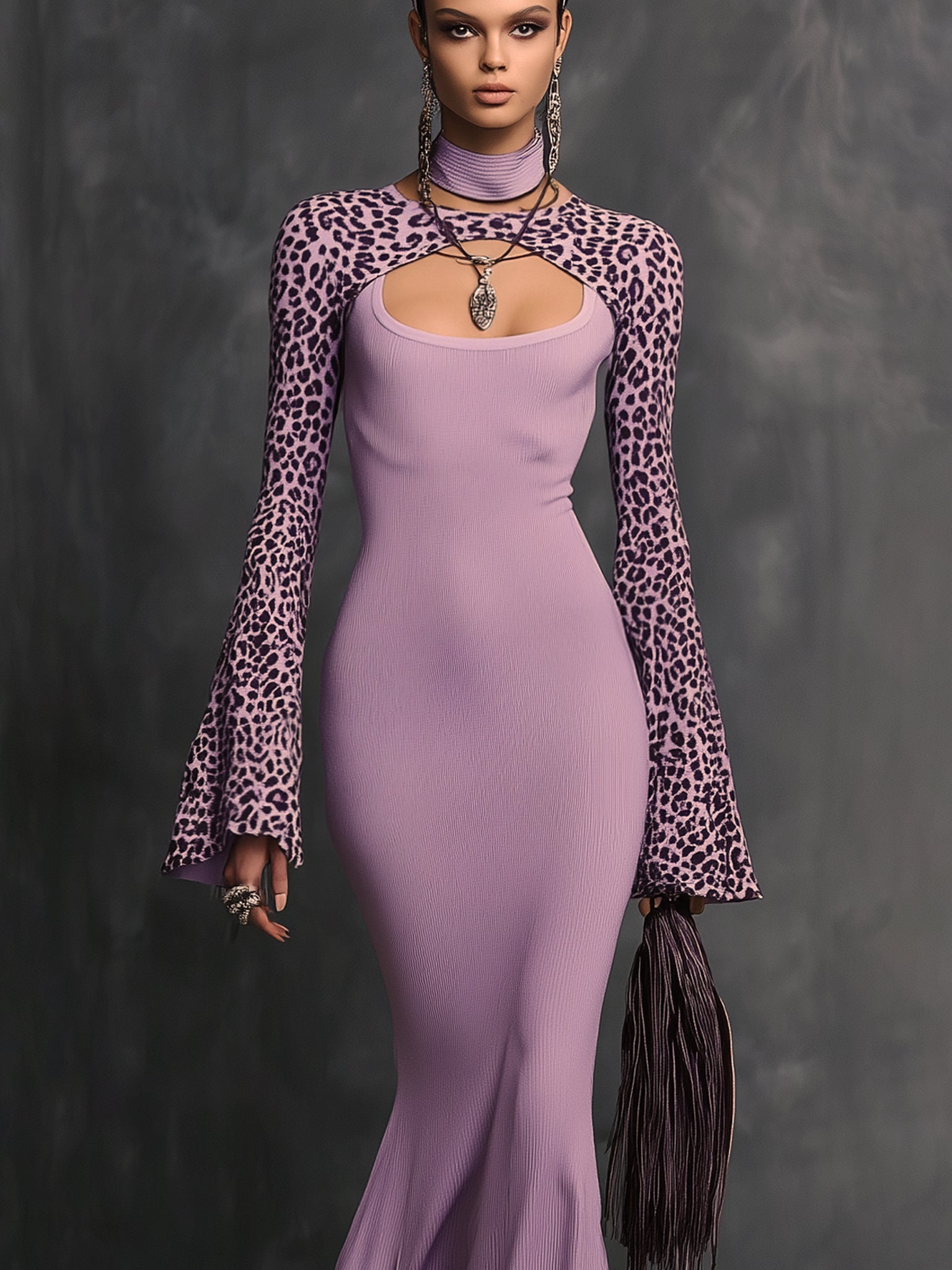 Design: This standout maxi dress features a daring chest cutout framed by bold leopard-print sleeves, creating a double-layered look. The flared cuffs and high neckline add drama and dimension, while the dress gradually flows into a pleated, fishtail-inspired hem.
