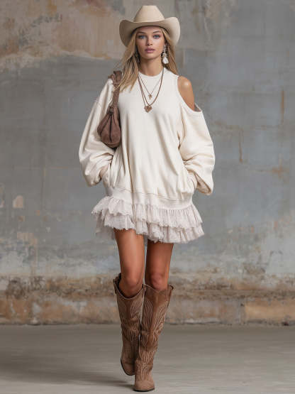 2. Design: Round neck, off-the-shoulder design, lace ruffle trim, two pockets.