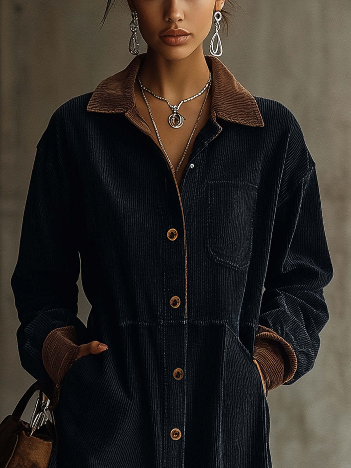 - Material: Made from soft corduroy, featuring a contrast collar and cuffs for added style.