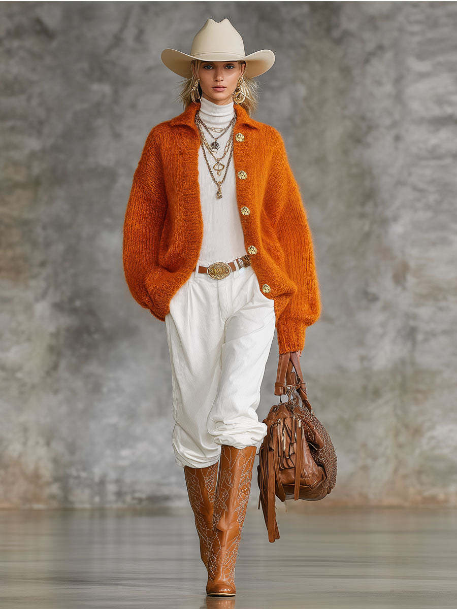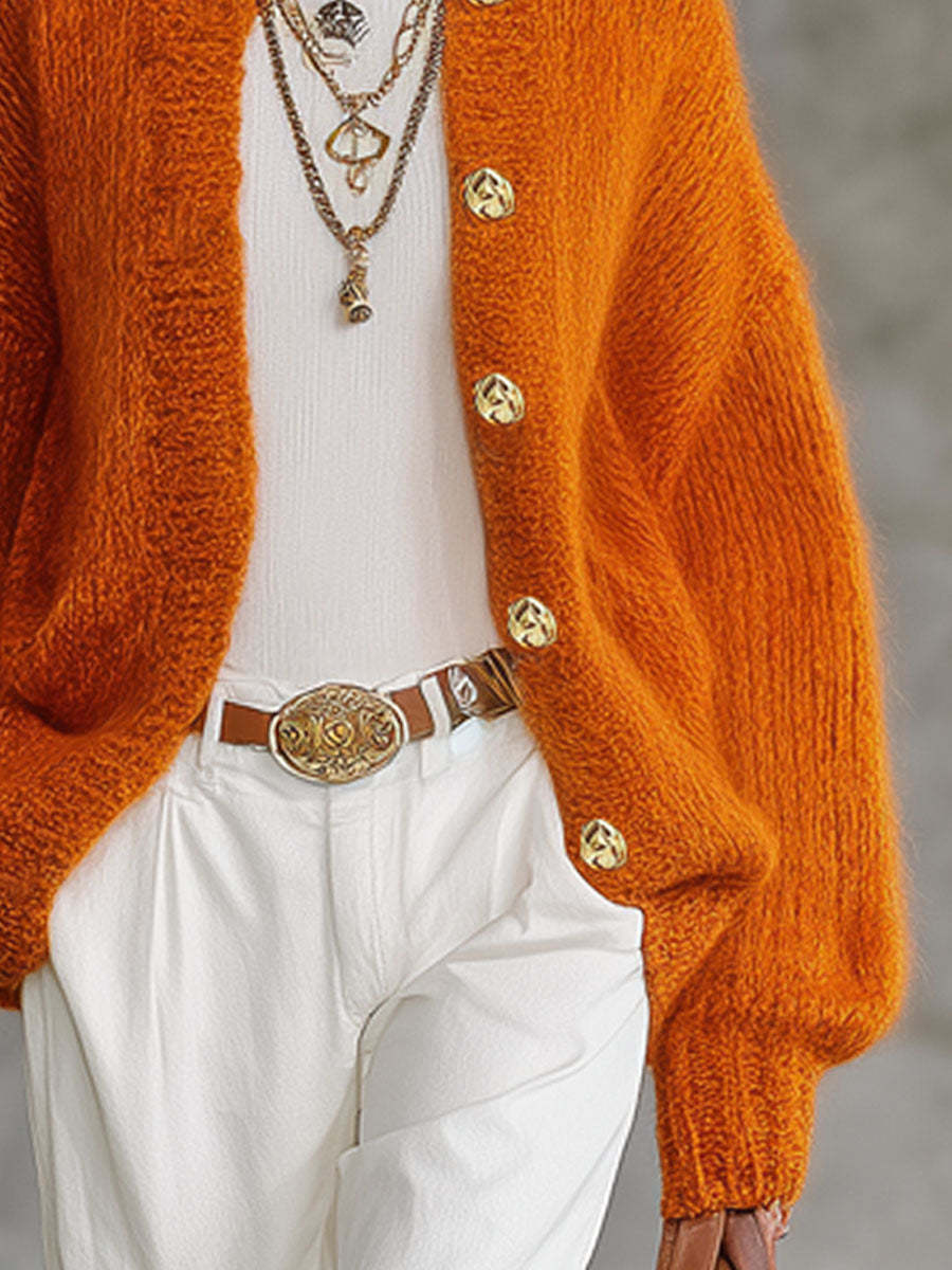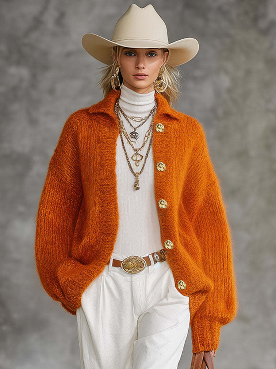 Versatile and easy to style, this cardigan can be worn over a simple t-shirt and jeans for a casual look or layered over a dress for a more polished ensemble. With its relaxed fit and comfortable fabric, the Orange Lapel Single-Breasted Knitted Cardigan is an essential addition that combines practicality with a flair for fun, ensuring you stay both warm and fashionable all season long.