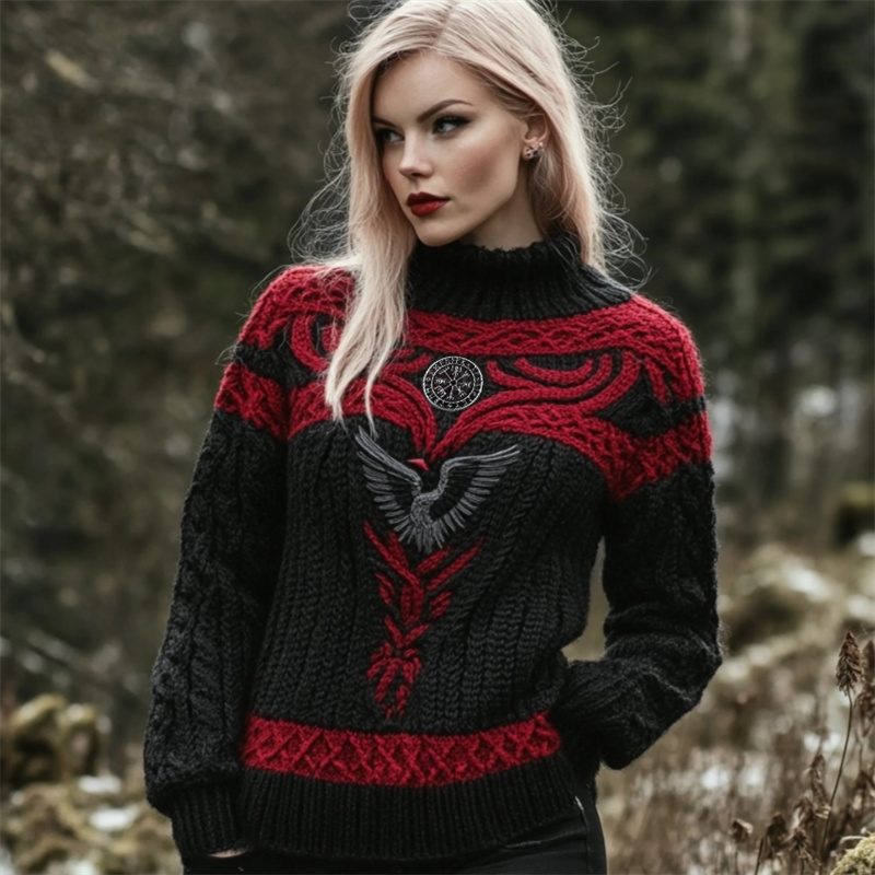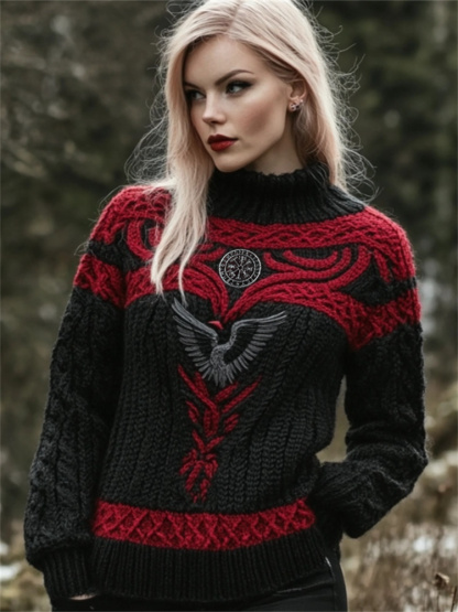 Raven Viking Vegvisir Embroidered Celtic Contrast Cozy Chunky Sweater