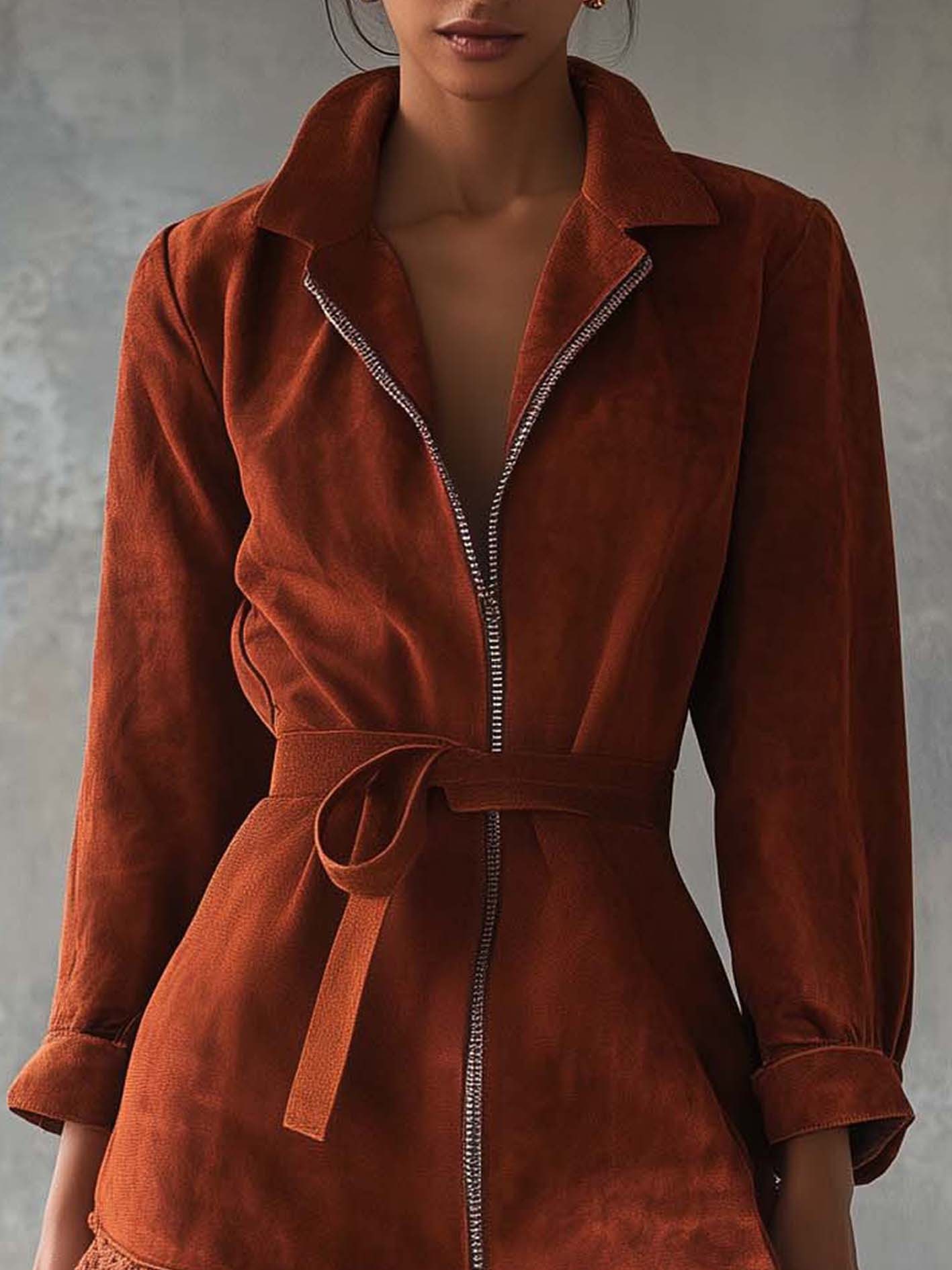 This reddish-brown faux suede mini dress strikes a balance between edgy and elegant. The bold zipper brings a modern, functional twist, while the lace hem softens the look with a romantic and feminine touch. The belted waist adds definition, highlighting the silhouette, and the faux suede texture offers warmth and richness, making it a versatile seasonal piece.