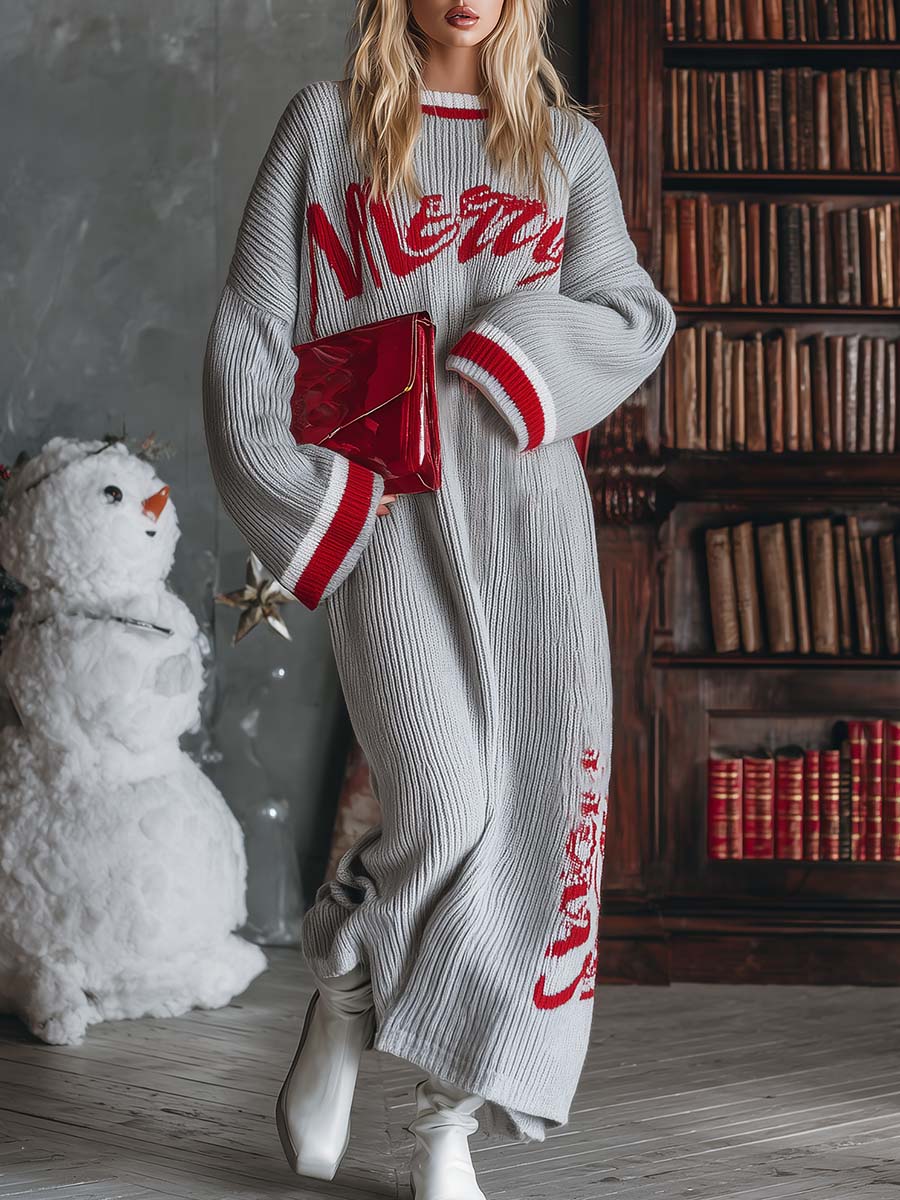 The Retro Chic Oversized Round Neck Letter Pattern Light Gray Knit Maxi Dress offers a harmonious blend of vintage charm and modern style. This maxi dress is crafted with a timeless light gray hue, enhanced by an oversized fit that exudes comfort and a laid-back vibe. The prominent letter pattern design adds a playful yet sophisticated edge, making it a standout piece in any wardrobe.