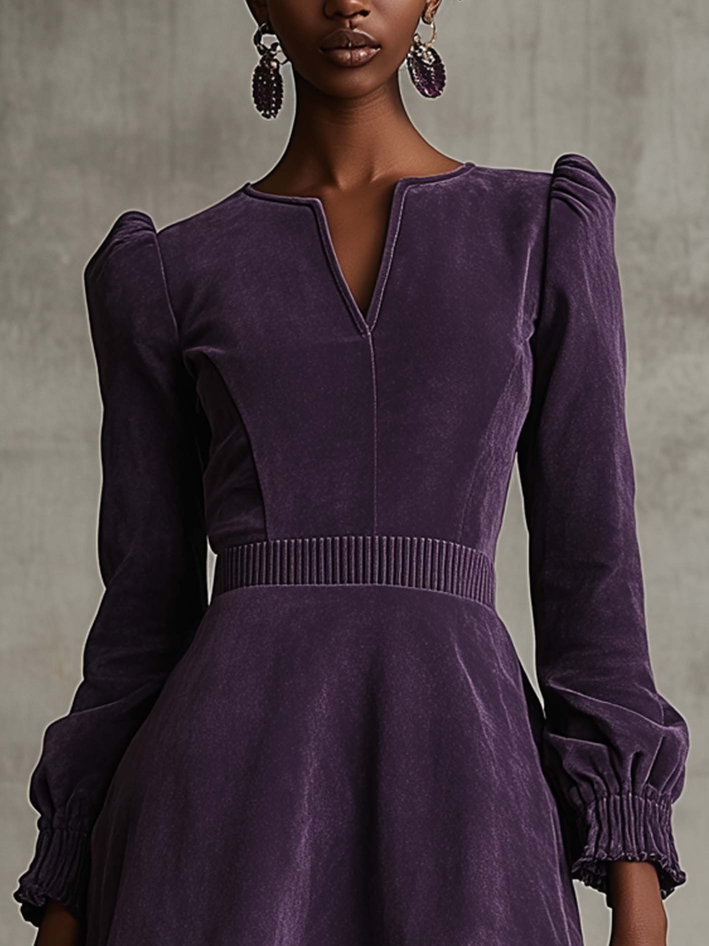 - Design: A retro-inspired mini dress in deep purple, featuring puffed shoulders, long sleeves with gathered cuffs, and a subtle V-slit neckline.