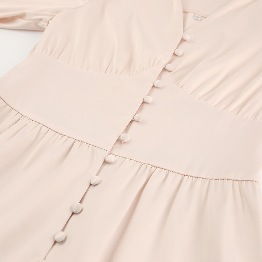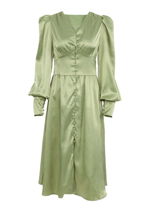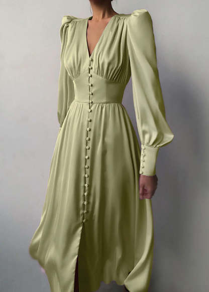 Slim Fit Green V Neck Wrinkled Silk Maxi Dress Puff Sleeve
