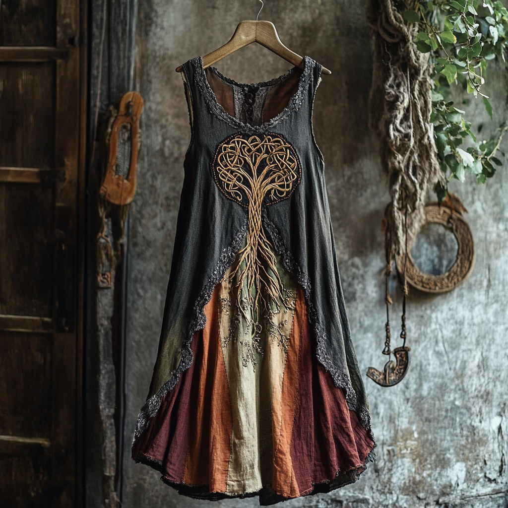 Tribal Celtic Knot Life Of Tree Lace Contrast Color Art Linen Tank Dress
