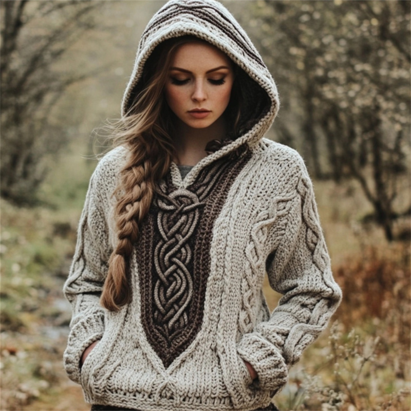Vintage Celtic Contrast Color Chunky Cozy Hooded Sweater