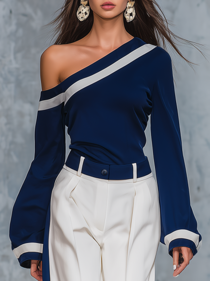 2.Design: One-shoulder, long-sleeved, contrasting stripe, two-piece set