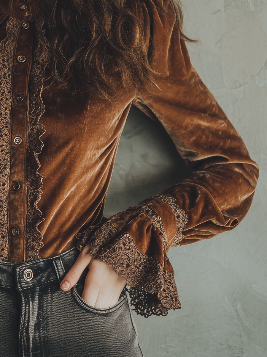 The Vintage Lace Cuffs Poly Velvet Blouse is perfect for those who appreciate the beauty of vintage fashion with the comfort of modern fabrics. Whether you're headed to a formal event or a casual get-together, this blouse is sure to become a favorite in your wardrobe. Embrace elegance and make a lasting impression with this exceptional piece.
