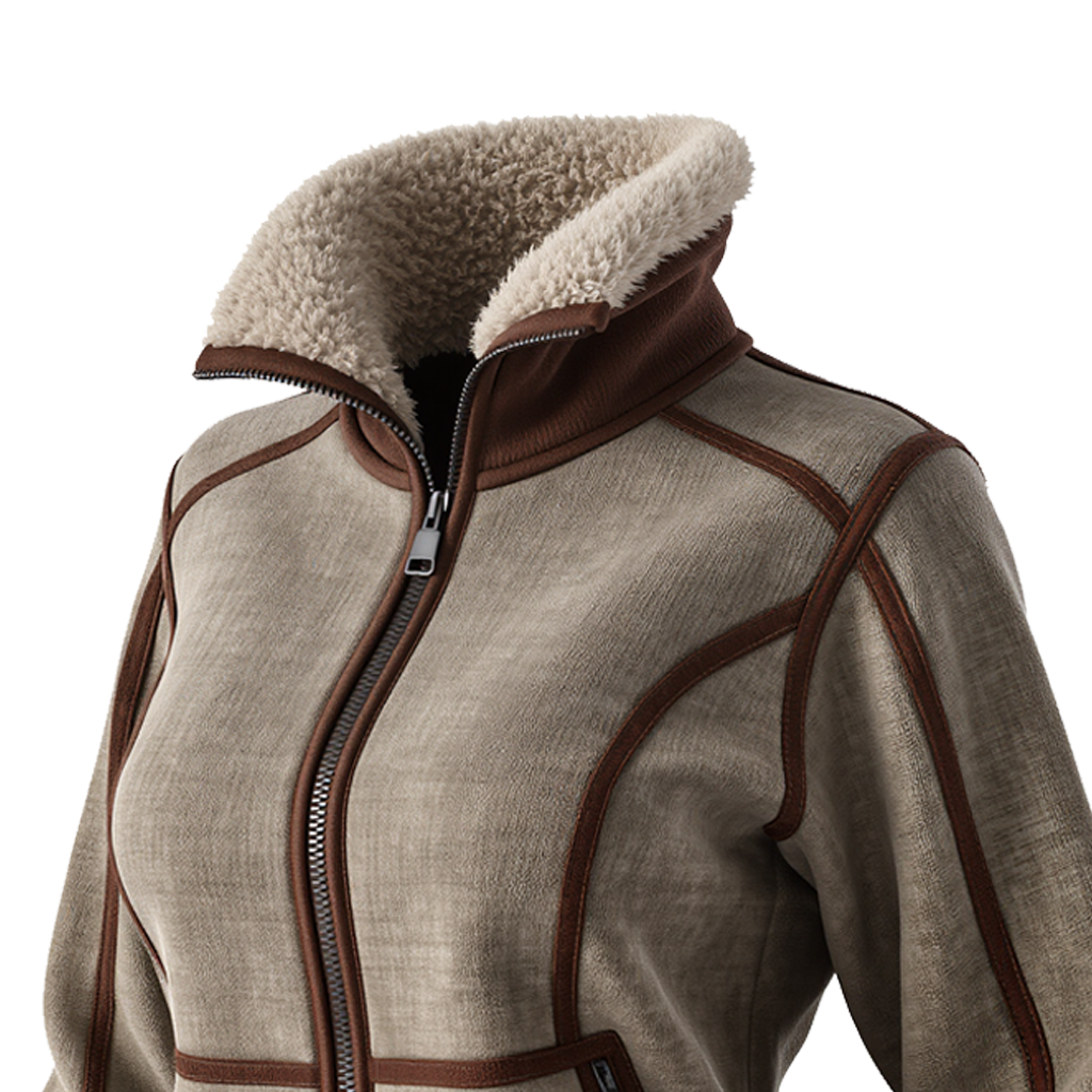• Design Elements: Sherpa-lined collar, zippered side pockets, sleek zipper closure