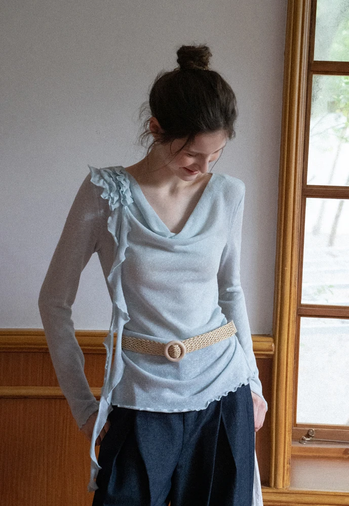 Women Draped Cowl Neck Ruffle Trim Belted Top