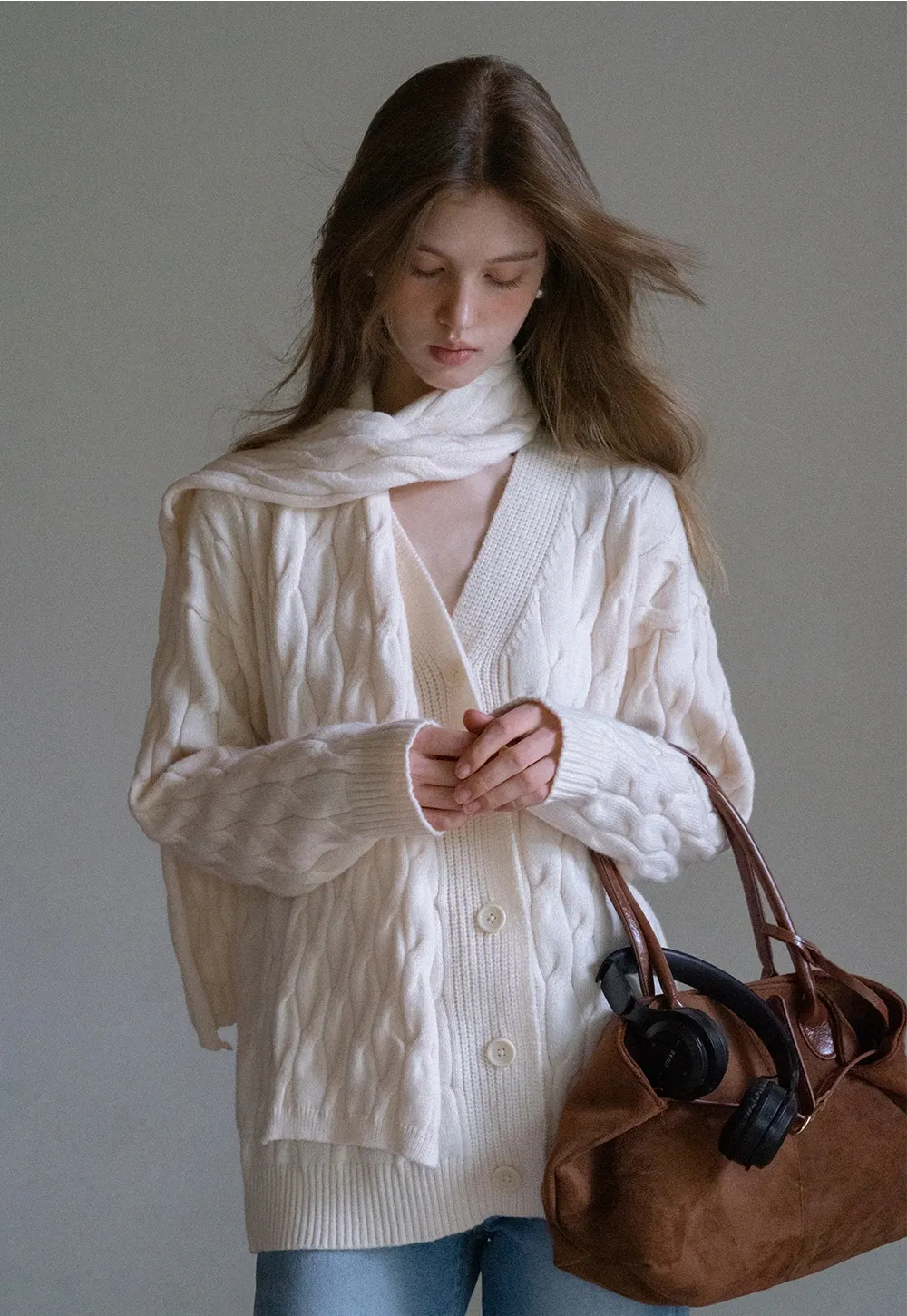 Womens Cable Knit Cardigan Sweater with Matching Scarf