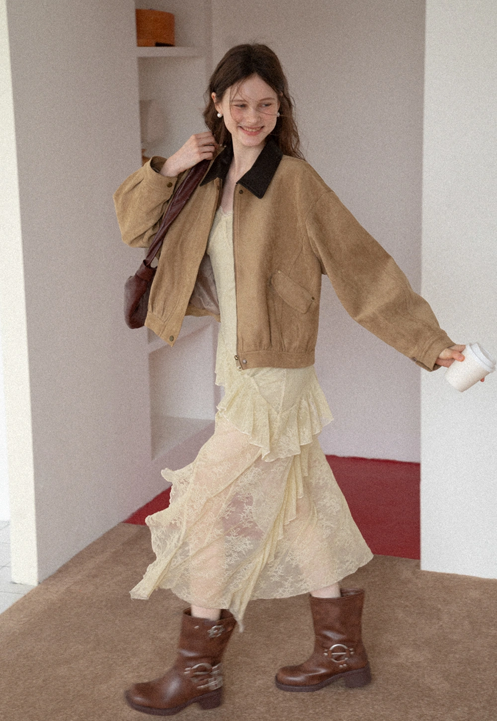 Women's Contrast Collar Faux-Suede Bomber Jacket