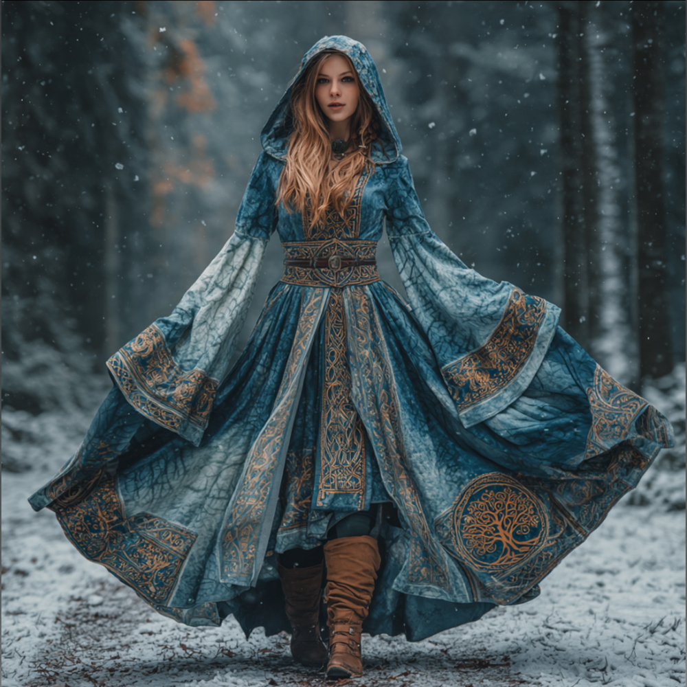 Women's Viking Style Gold Print Tree Of Life Blue Tie Dye Cape