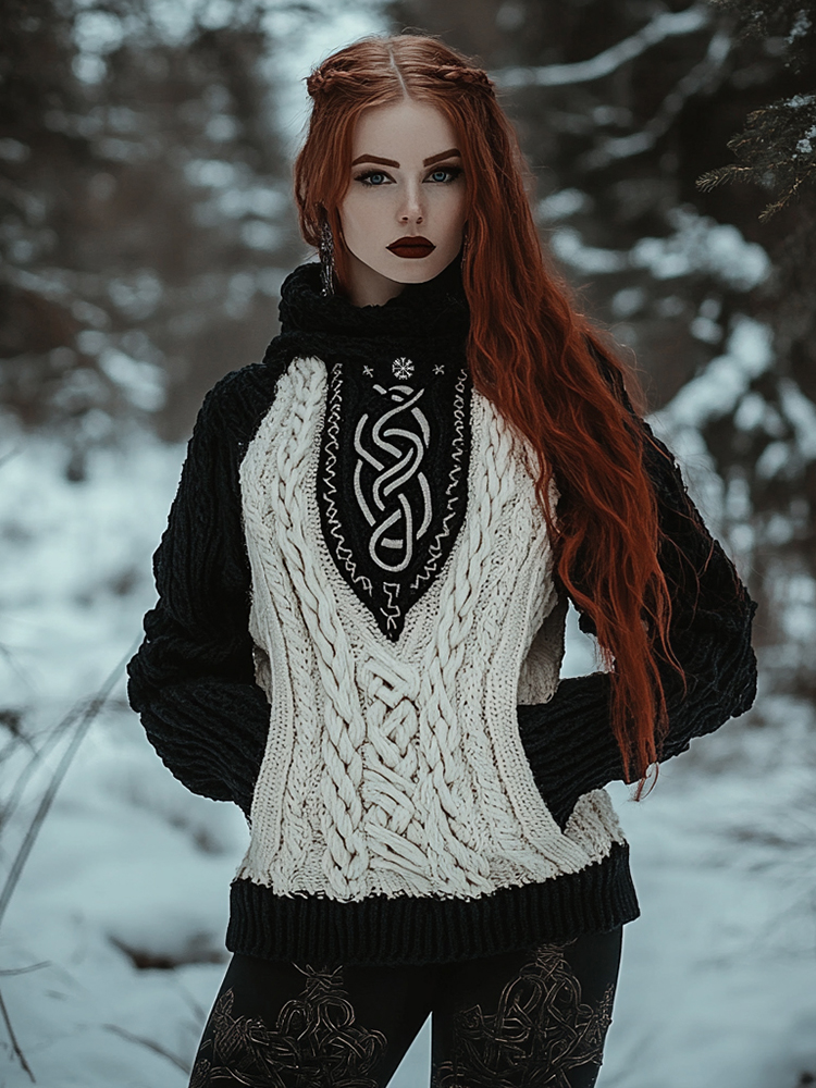 Women's Viking Tribal Jacquard Celtic Inspired Chunky Knit Hooded Sweater