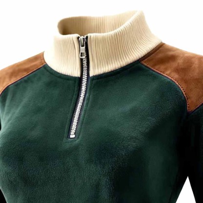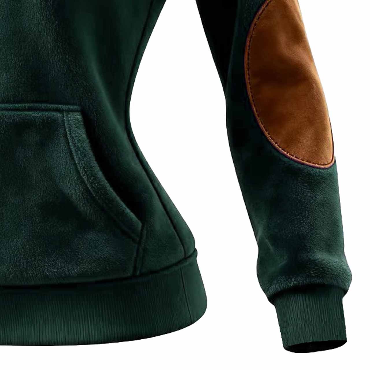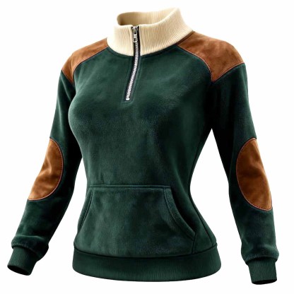 • Design Elements: Contrasting shoulder and elbow patches, half-zip closure, front pocket