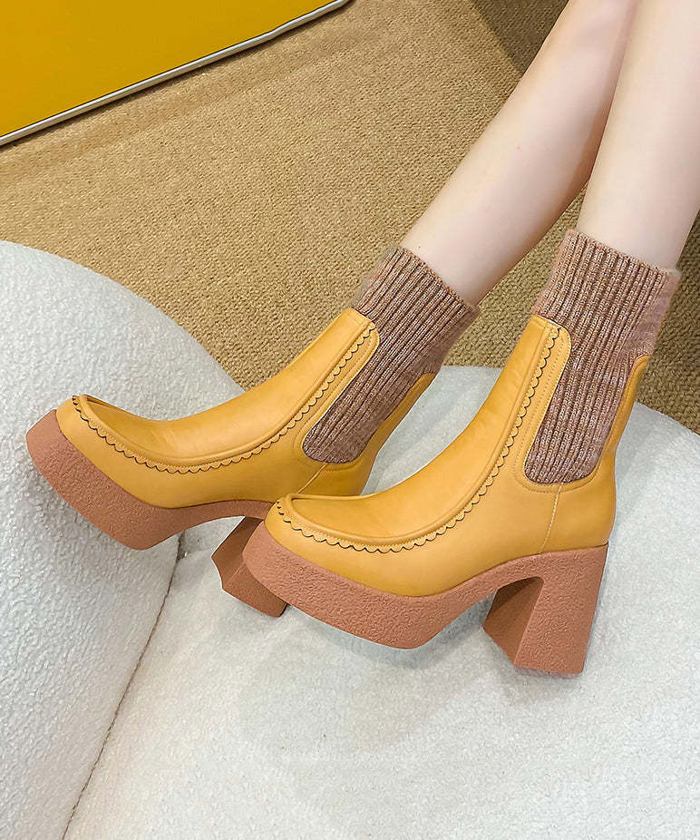 Yellow Knit Fabric Splicing Cowhide Leather Chunky Heel Boots